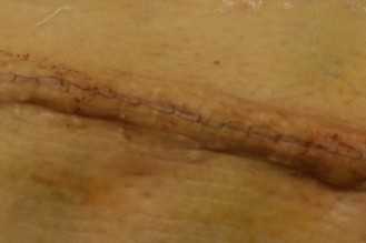 きっちり引っ付くまでの間、しっかり太い糸で縫われているので、糸形の跡が残ります。これがスーチャーマークと言われるものです。