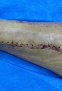 1層縫いなので、傷がきっちり引っ付いてから抜糸しないと傷が開くので、きっちり引っ付くまで約2週間おいて抜糸を行います。