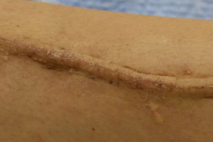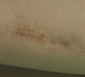 傷跡の幅が太く(5mm-1cm)、魚の骨の様に例えられるスーチャーマークが見られる傷跡です。